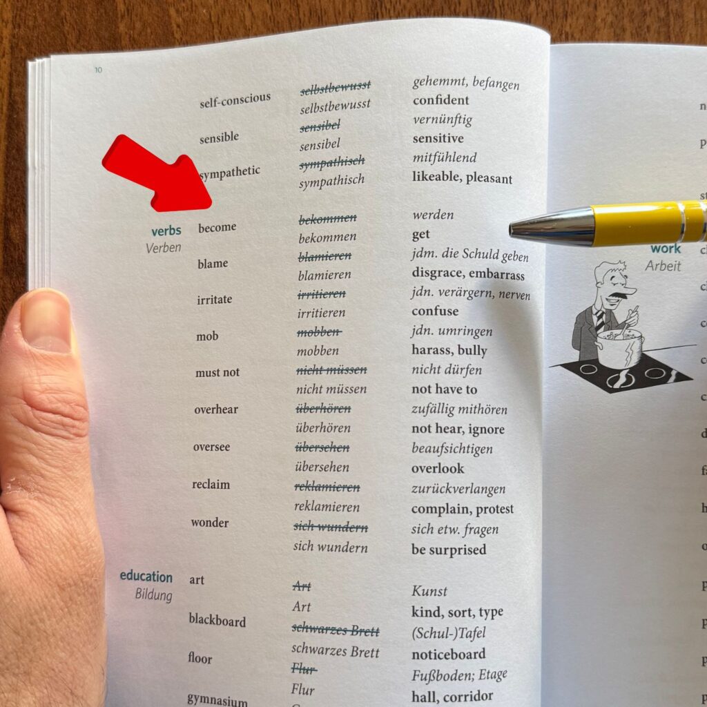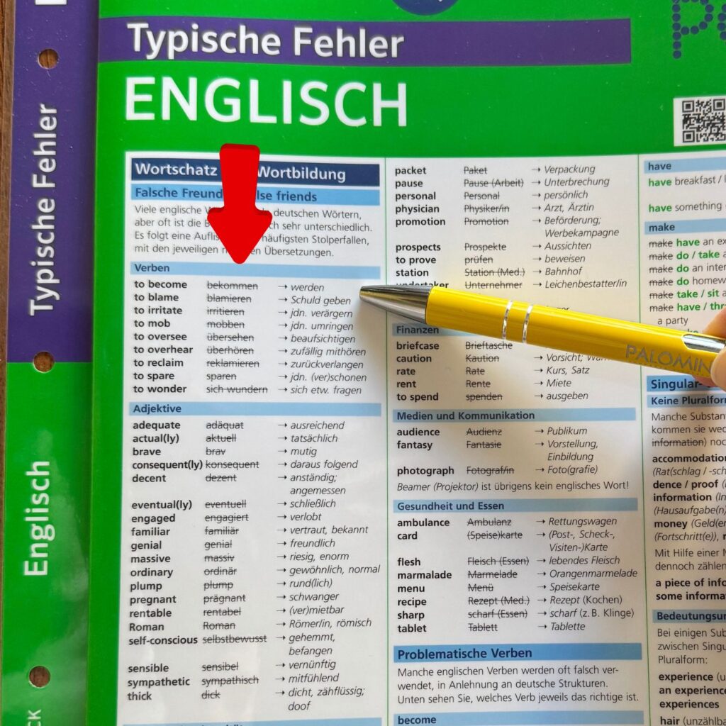 Jedoch würde ich trotzdem das Buch Fehlerfrei Englisch von Langenscheidt empfehlen, einfach weil ich die Erklärungen viel besser finde. Hier nur ein Beispiel: Im Vokabelteil der Übersichtskarte werden Vokabeln aufgelistet, die Deutschsprachige Menschen verwechseln. Ein Beispiel ist das Wort „werden“, was auf Englisch „become“ heißt (siehe Bild). Diese Art von Vokabeln nennen wir falsche Freunde, also „False Friends“.
